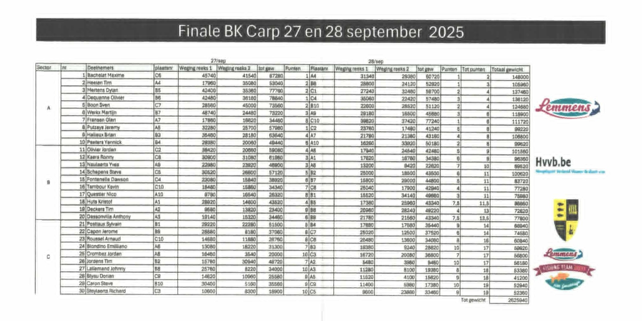 Félicitations aux 20 premiers, qualifiés pour le Championnat de Belgique les 27 & 28 septembre 2025 à l'étang De Neppe à Zichem.