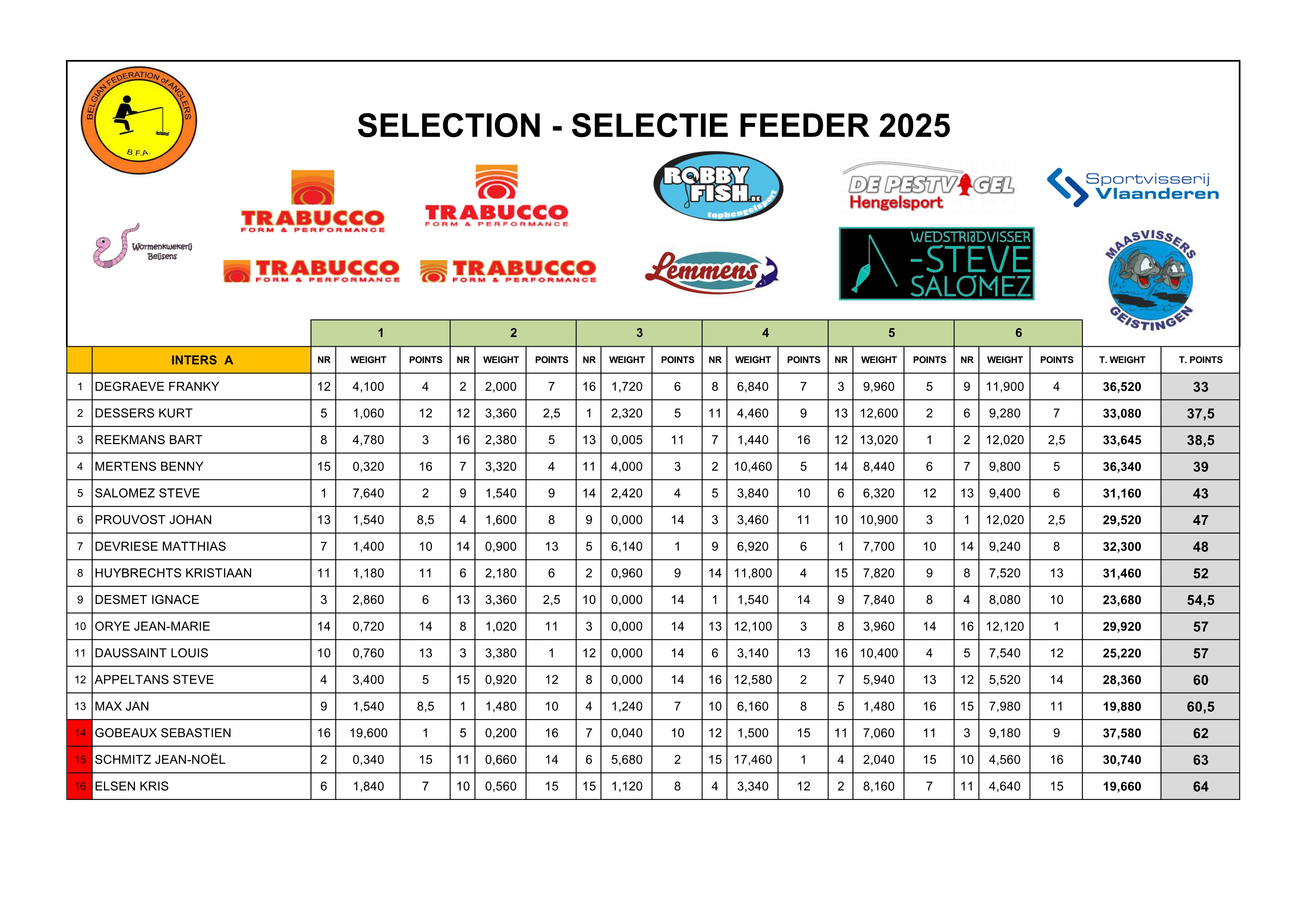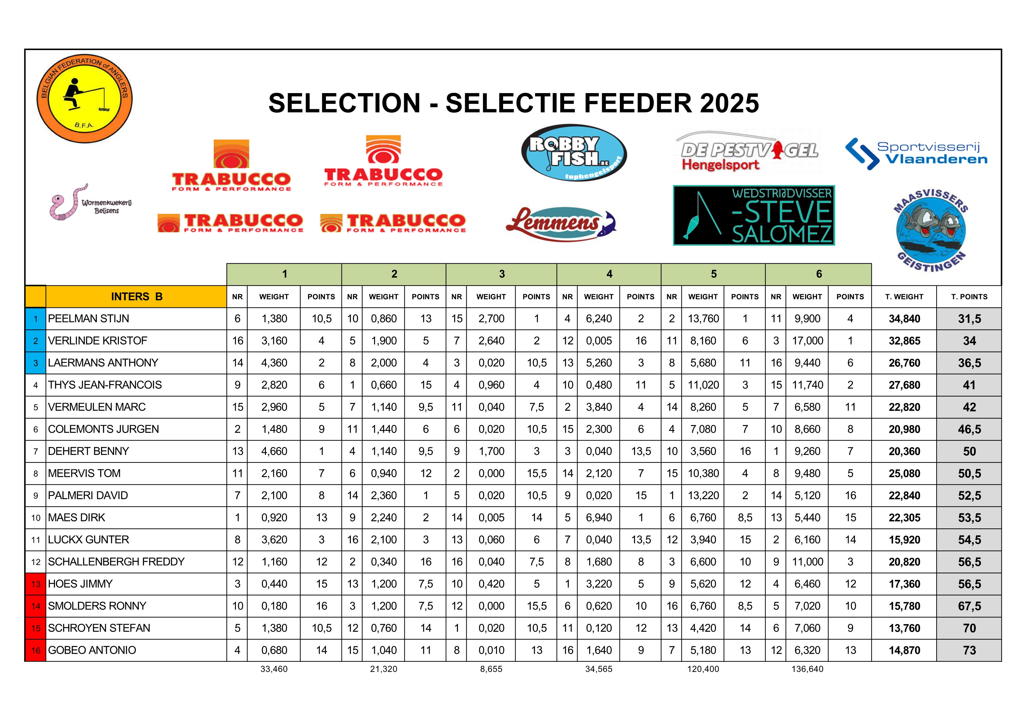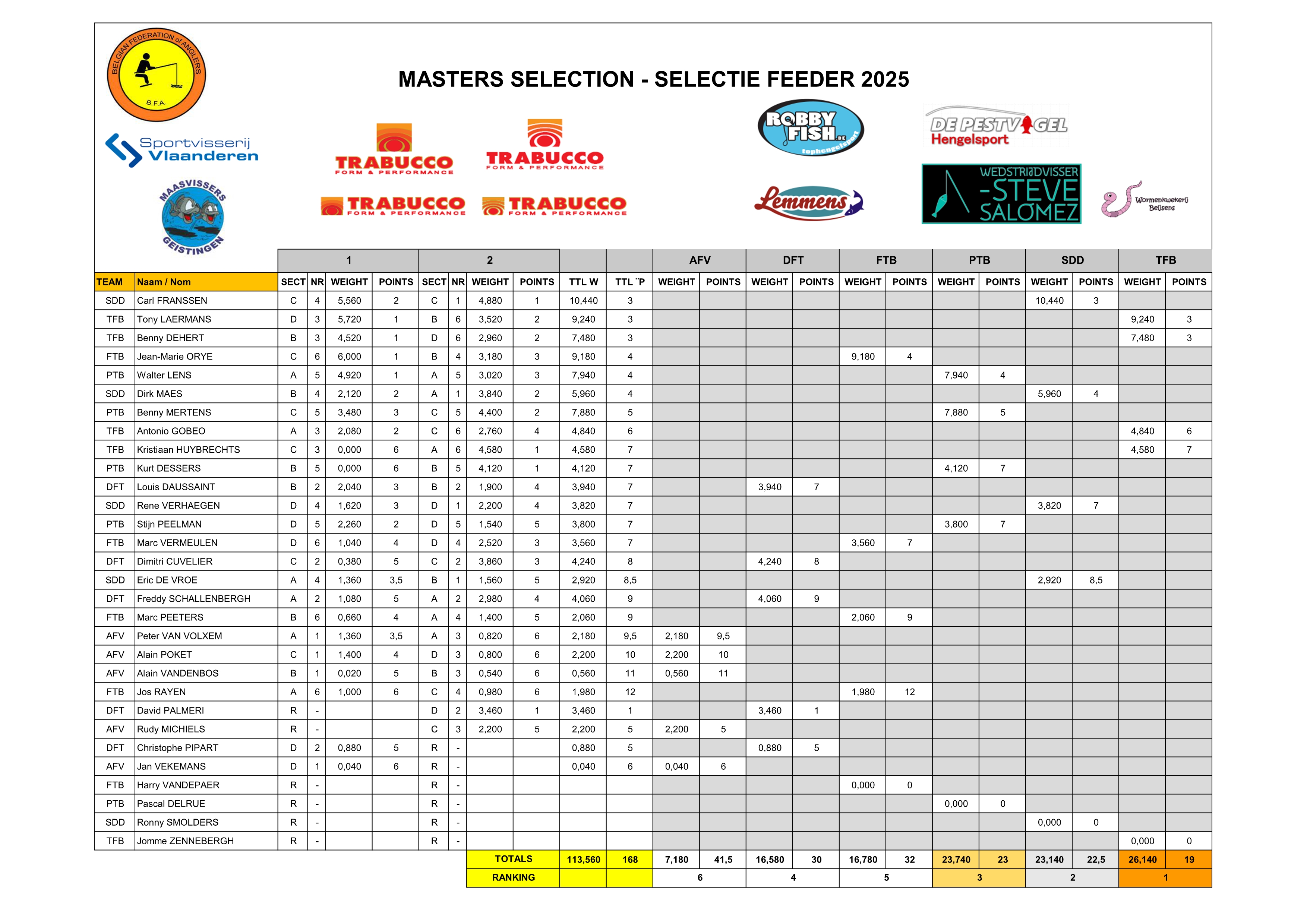La team Sensas Liège termine aux pieds du podium avec 63 points, devant l'équipe Noord Vissers Team Adinkerke 75 points tandis qu' Onder Ons Lede se classe en 6e position avec 80.5 points